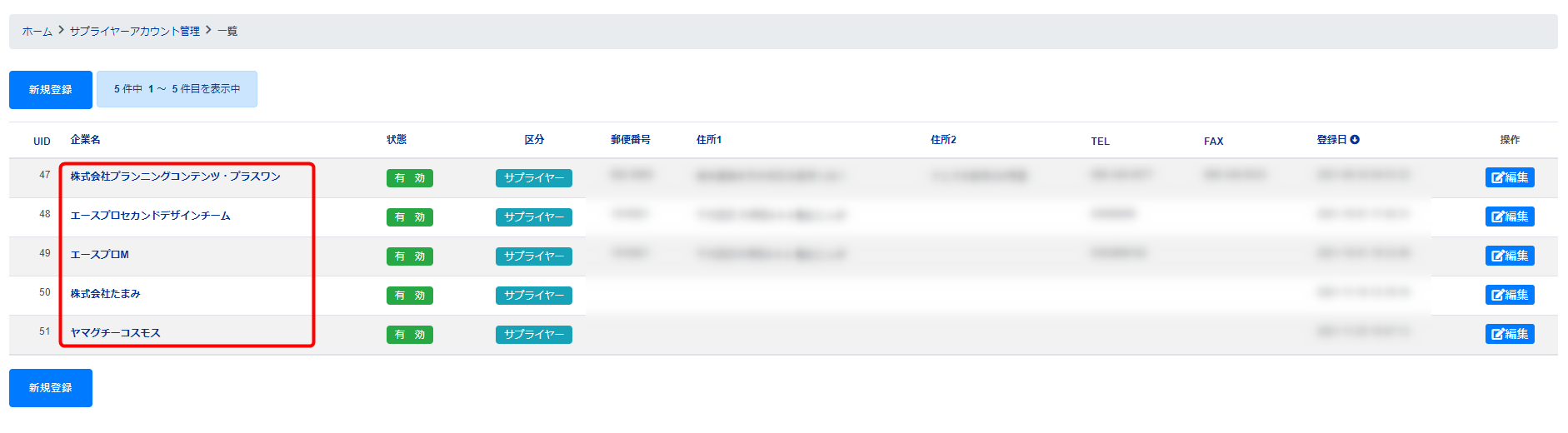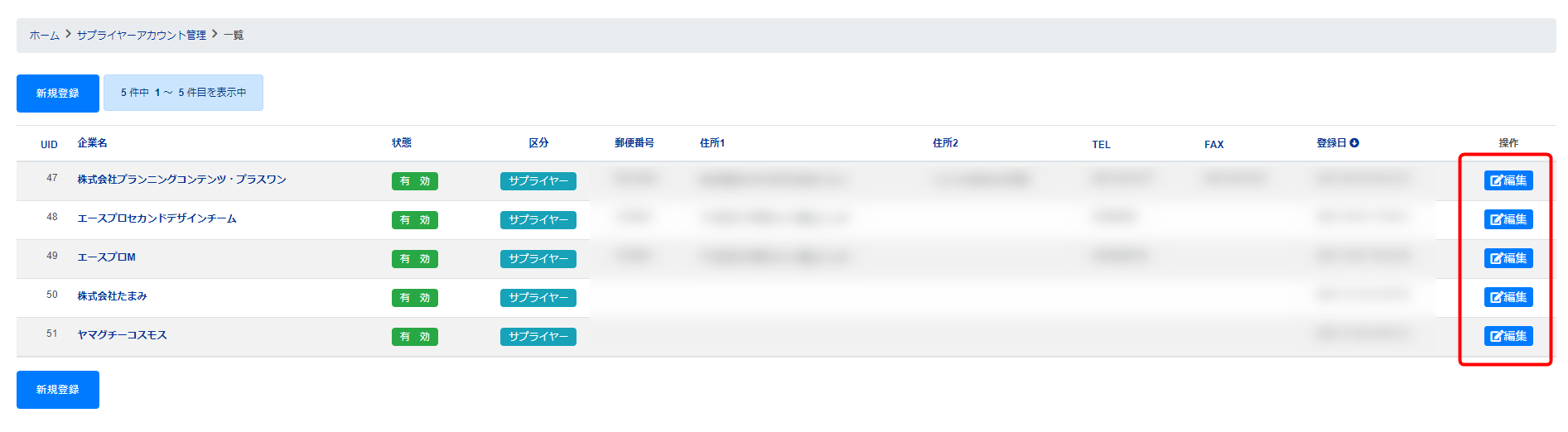 登録したサプライヤー情報を編集するには、「サプライヤーアカウント管理」→「編集」より行う事が可能です。