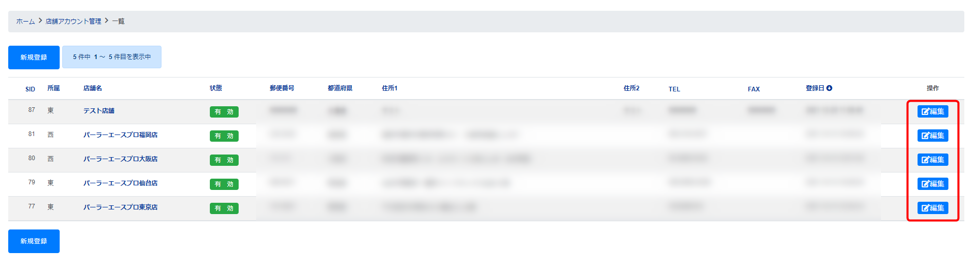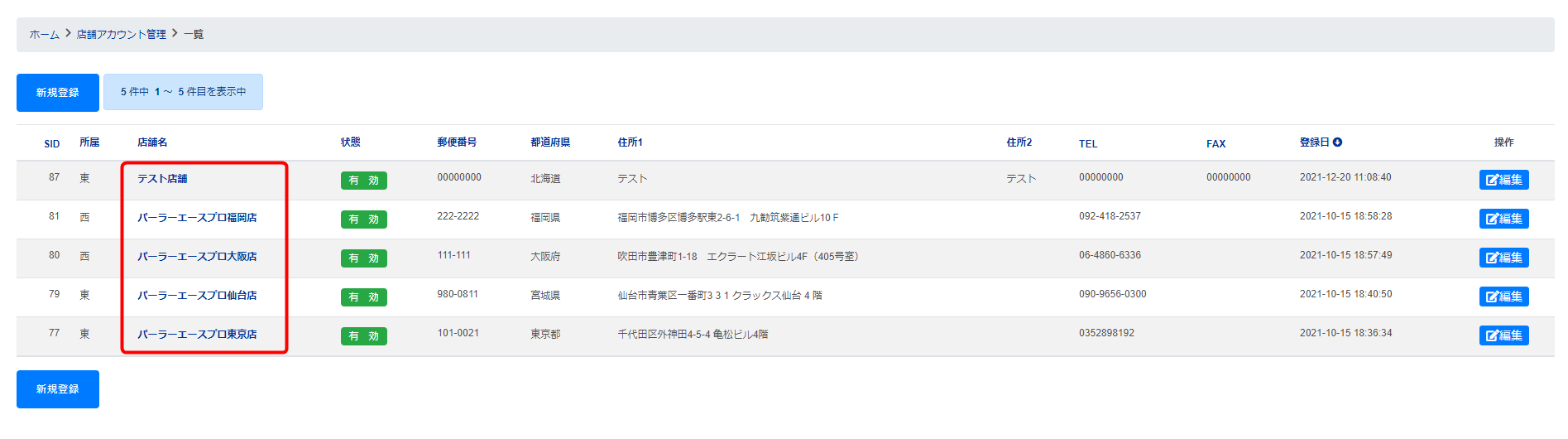 本社アカウントの「店舗アカウント管理」→「新規登録」をクリックします。